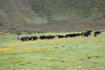 走到一處草坪,南杰和吉美下馬一起去扶雍貝,說是在此處稍作歇息。雍貝的臉色恢復(fù)了紅潤,他取下盤香枝插進(jìn)吉美濃密的頭發(fā)里,兩人由此發(fā)出了嬉笑聲。馬兒徑自走向草坪深處的水洼里飲水,打著酣暢的響鼻,頸項(xiàng)上銅鈴鐺隨馬兒鬃毛的抖動(dòng)發(fā)出了“鐺鐺”的聲音。馬兒飲飽了水,轉(zhuǎn)身朝我們走來。繼續(xù)騎行,不知過了多久,日光在頭頂上游移,漸漸偏西。雍貝在前方問南杰,阿尺,巴烏牧場還有多遠(yuǎn)?南杰指向眼前的山峰說,登上這座峰頂就到了。回望一路經(jīng)過的河谷,早已不知去向,我們身處的位置幾乎與周遭巍峨的山巒平齊了。我從衣兜里取出手機(jī)測試海拔高度,4820米。