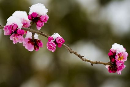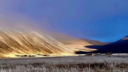 季春初始,濃霧夾帶著高原的寒風,彌漫在這片純凈素簡的大地上。朦朧中,紛紛揚揚的春雪,落在山峰,落在河谷,落在屋檐,落在林間,頃刻間就給萬物披上了銀白色的春裝。山麓、河谷、村落被白色潤染,像是喚醒一簾純白的甜蜜美夢;枯樹、春花、牧草被水汽滋潤,像是撫慰一冬的孤獨清寂。