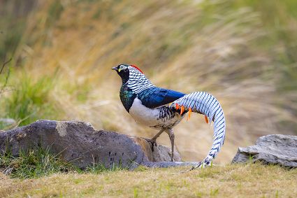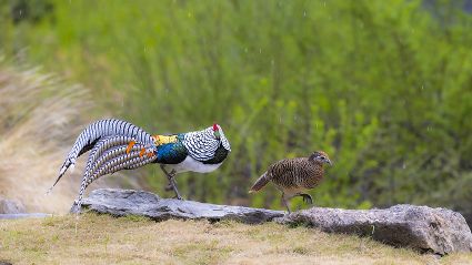 4月16日,筆者在康定市雅拉鄉(xiāng)境內,再次拍攝到國家二級保護動物白腹錦雞求偶的清晰視頻。一只色彩斑斕的雄鳥,拖著黑白相間的云狀斑紋尾羽,圍著雌鳥跳起了“圓舞曲”。整個求偶過程有十多分鐘。每年三至五月是白腹錦雞求偶期。