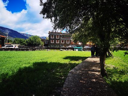 夏日,暖陽溫柔,沿途入眼皆是綠意。聽說,俄色花盛放的時候,潔白的花成簇成團,一樹樹漫山遍野,像九天的云朵堆滿山谷田野,汽車從公路疾馳,風里都是俄色的清香。我們來的時候稍微遲了,錯過了俄色的花期,花開荼蘼,殘花在蒼翠的枝葉里躲藏,風里是飛舞的花瓣,紛紛揚揚,在棕紅的棧道鋪成白色的云錦,樹下是芬芳的余味。棧道邊,金黃的雪白的野花鋪灑在翠綠的草甸上,像濃烈的水彩。地里的青稞,綠得晃人眼睛,綿延的是木雅人勤勞與希望。遠處,木雅民居在各種深綠淺綠的陪襯下更加的濃墨重彩。