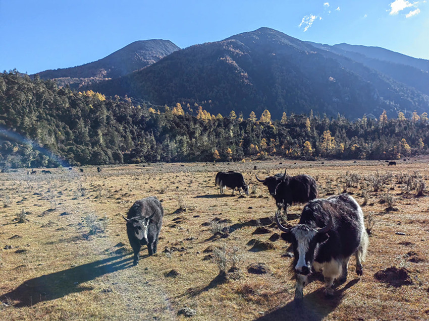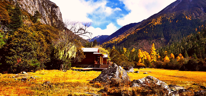 站在山谷放眼展望,金黃的草甸、蜿蜒透亮的小河、參天古木、悠閑啃草的牦牛,點綴其間的幾棟藏房,這一切構(gòu)成一個幽靜而神奇的世界。步入其間,就像走進(jìn)一個奇麗而孤寂的世外仙境以及純凈空氣的薈萃之地。置身其中,心曠神怡,仿佛自己是走在一幅渾然天成的美麗畫卷之中。