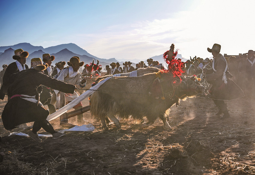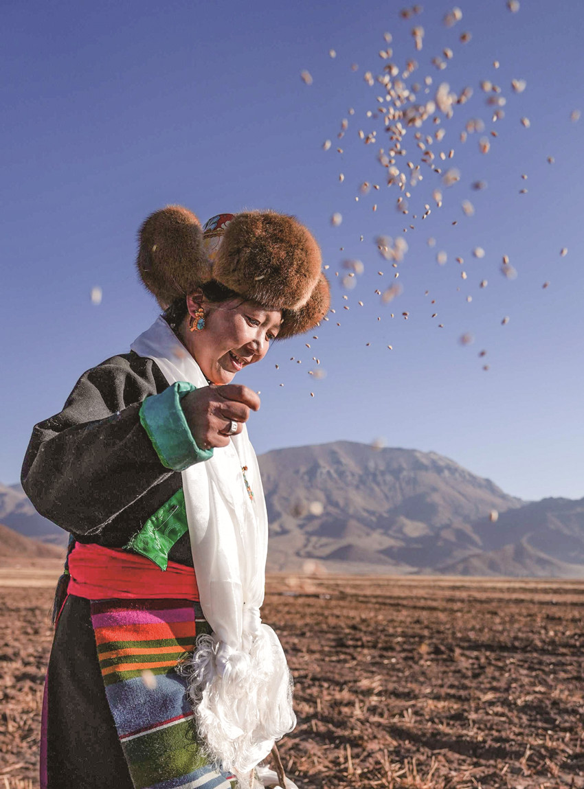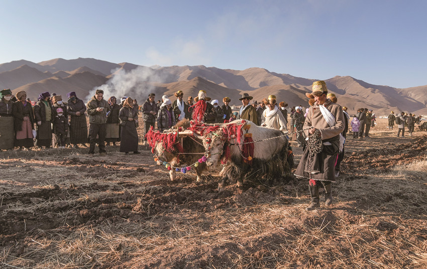 近日,西藏農(nóng)民舉行一年一度春耕大典。村民沿襲著傳承千年的春耕民俗,身著節(jié)日盛裝,手捧“切瑪”(五谷豐登斗),唱起祈愿歌,互敬青稞酒。當(dāng)鐵犁翻開(kāi)土地,婦女將手中的種子撒下,祈求新的一年豐收。