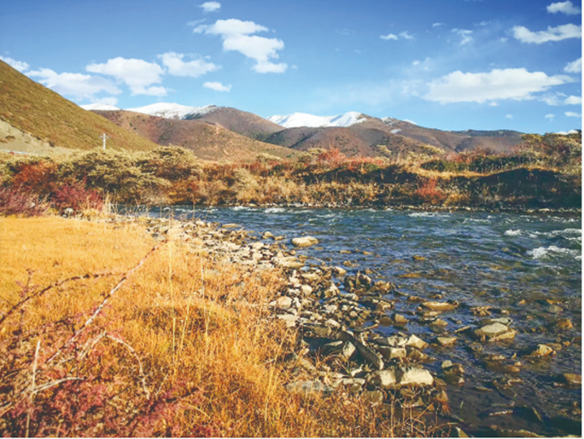 其秋,紅黃相間,斑斕錦繡,云影徘徊。青稞飄香,似金波蕩漾,赭黃綾羅,一派秋色淋漓,渾然天成。