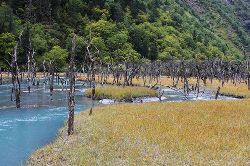 康東地區(qū)海拔最低的海子。澄碧的湖水與雪山融為一體,海子中細(xì)紗沉積,形成色彩斑斕的河床,令人仿佛置身海濱。海子中還有“湖中長樹,樹會走路”、“石頭說話”、“半壁穴居”等神奇景觀。