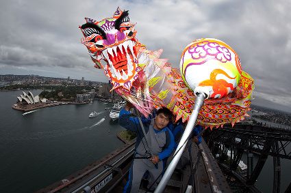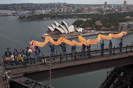 當(dāng)日,由當(dāng)?shù)厝A人團(tuán)體精心準(zhǔn)備的中國傳統(tǒng)舞龍亮相悉尼海港大橋,拉開中國新年慶祝活動的序幕。