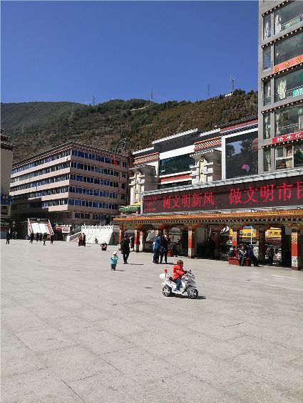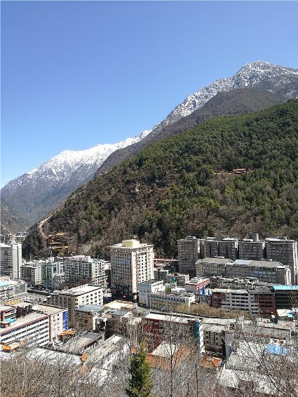 天空像剛被浸染的綢緞,蔚藍(lán)的主色已經(jīng)略顯;白雪好似從浸染的綢緞上滴落下的顏料與其它顏色的混合,眷戀的駐足在山尖,在其耳旁?xún)A訴來(lái)年的約定;一顆顆萬(wàn)年青穩(wěn)穩(wěn)的站立,將山中的寺廟、亭閣緊緊地包圍,見(jiàn)證著康定四季輪回的變化;依然披著秋冬贈(zèng)予黃色外衣的樹(shù)木,拋開(kāi)桎梏,堅(jiān)守在一座座樓房旁。藍(lán)與白,黃與綠……這大美的晴天為人們帶來(lái)了別樣的視覺(jué)盛宴。
