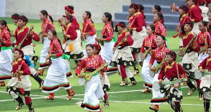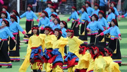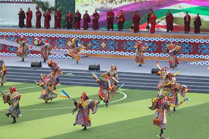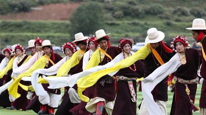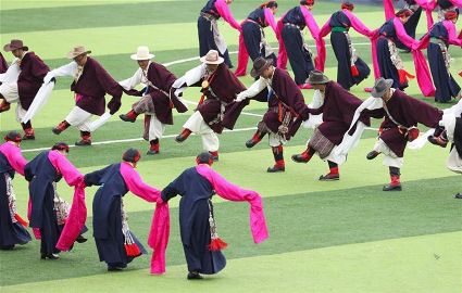 7月29日,來自四川省道孚縣各地的上萬名藏族群眾在道孚中學(xué)載歌載舞,歡慶第三屆安巴農(nóng)耕文化旅游節(jié)。安巴在藏語中是五月的意思,藏歷五月正值農(nóng)閑時(shí)期,藏族群眾都會舉行各種活動,祈禱風(fēng)調(diào)雨順,吉祥平安。