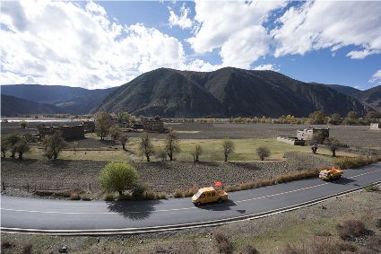 新都橋,被譽為攝影家的天堂,在這個風景如畫的地方,到了秋季,筆直的道路兩旁滿是金色的白楊樹,高大的樹木、金黃的樹葉,在藍天、白云和燦爛陽光的映襯下,就是一幅美麗的畫卷。