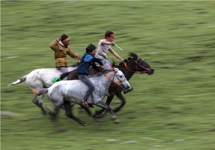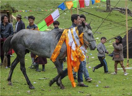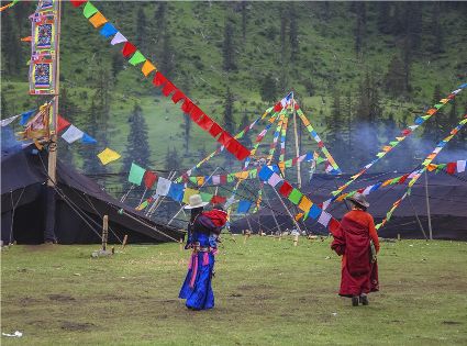 夏天是草原最美的季節(jié),道孚縣玉科草原在這個季節(jié)里正舉辦久負(fù)盛名的賽馬活動。五顏六色的彩帶飄舞在牛毛大帳篷周圍,喜慶氣氛四處洋溢。來自遠(yuǎn)近牧區(qū)的親屬也專程趕來玉科草原訪親會友,參與賽馬角逐,濃郁的民族盛會令人耳目一新。