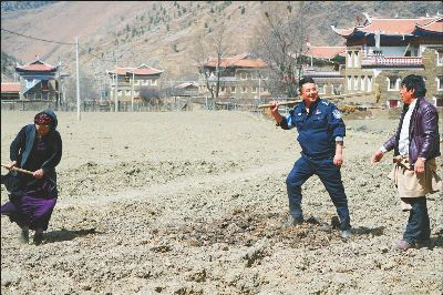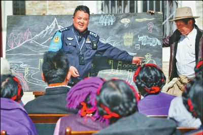 陽春三月,康定市甲根壩鄉(xiāng)扎日村壩子里,村民們圍在黑板前,認(rèn)真聽著民警巴桑呷瓦妙趣橫生、詼諧幽默的“授課”,時不時發(fā)出開心的笑聲。
