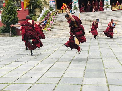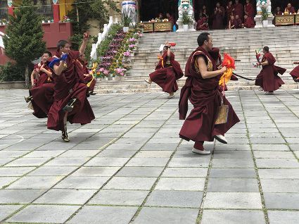 跳神儀式開始,南無寺內(nèi)鼓號齊鳴,喇嘛身著顯耀盛裝,點燃新綠松枝,幾縷藍(lán)色煙紋升起。一支由法鼓、鈸、海螺、法號等組成的寺廟樂隊自大殿而出,順時針繞場一周落座場邊,群神出場繞圈而舞,以示凈化場地,祈請諸神入位。接著,象征護法神舞、骷髏舞、鹿神舞、黑帽咒師舞和金剛力士舞的演員手持各類法器挨個入場手舞足蹈。舞蹈的起落根 據(jù)場邊奏響的器樂節(jié)奏進行。最后由眾神驅(qū)鬼逐邪,押送“朵馬”(由糌粑捏成用以供神施鬼的食品)至寺外拋丟焚燒,以示驅(qū)逐一年的邪魔,祈禱來年安樂。