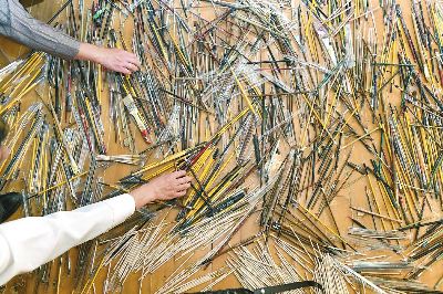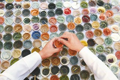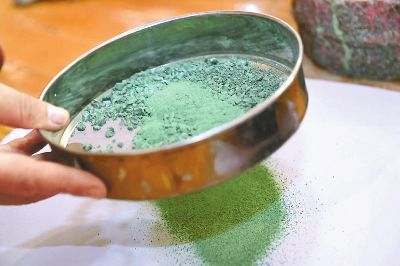 傳統(tǒng)的唐卡是藏族文化中一種獨具特色的繪畫藝術形式,需經(jīng)繃布、打磨、定位、起稿、涂色、暈染、拉線條、拉金線等多種程序,天然原料作色保證了畫作幾百年后色澤還依然鮮艷。在著著的畫室里,擺放了百個裝滿各色礦物質(zhì)顏料的調(diào)色小碗,“上色用的是延續(xù)千年的礦物研磨顏料?!睘榱俗岊伭献魃鶆?,著著還用自己的辦法搞出了專用的顏料攪拌機。