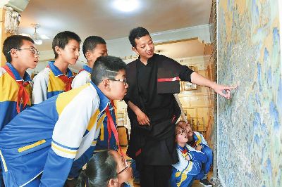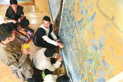 著著是當?shù)匦∮忻麣獾漠嫀?,?4歲從臨摹、勾線定型、著色染色開始學起,3年后就出師獨立作畫。17年時間,他繪制了3000多平方米的壁畫和數(shù)百幅唐卡,光筆就畫禿了20000多支。去年,著著憑借《南絲路一帶緣藏漢人一家親》成為當年文藝界最高獎山花獎的獲得者。今年,他圍繞“一帶一路、藏漢和睦”為主題而創(chuàng)作的大幅唐卡畫作也即將收尾。