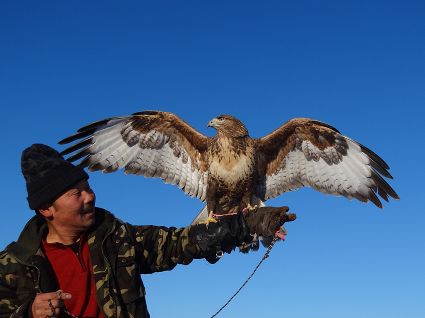 “小一點(diǎn)的鷹好訓(xùn),訓(xùn)老一點(diǎn)的叫熬鷹。 開始熬鷹前,一次性喂飽鷹,七天七夜不吃不喝不睡覺,待七天時(shí)到,放鷹于空,手中拿肉,用我們倆特殊的交流方式指揮它,這時(shí)它會(huì)落我的手臂上。但是,這一只始終沒服過我。訓(xùn)出來一只大約半月左右?!庇?xùn)鷹人說。