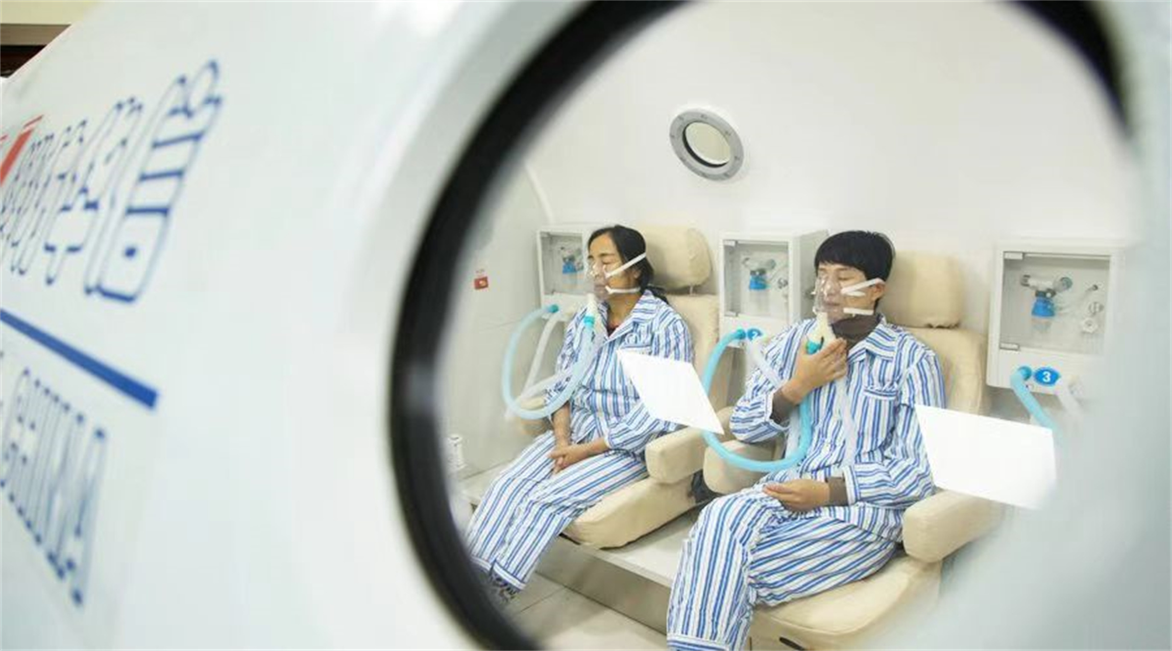 圖為游客們正在接受高壓氧艙治療。
