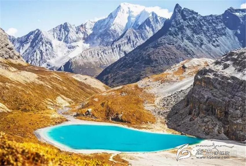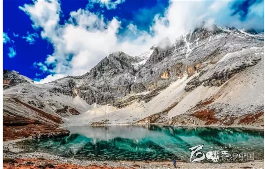 三神山中間的牛奶海,美麗的高原堰塞湖,面積0.5公頃,海拔4500米,四周雪山環(huán)繞,湖水清瑩碧藍(lán),山上成瀑,以其玲瓏秀雅水色翠藍(lán)而著名,牛奶海上方有大片的冰川。傳說每年春暖花開之時,湖水會像牛奶一樣潔白如瓊漿,并因此得名牛奶海。