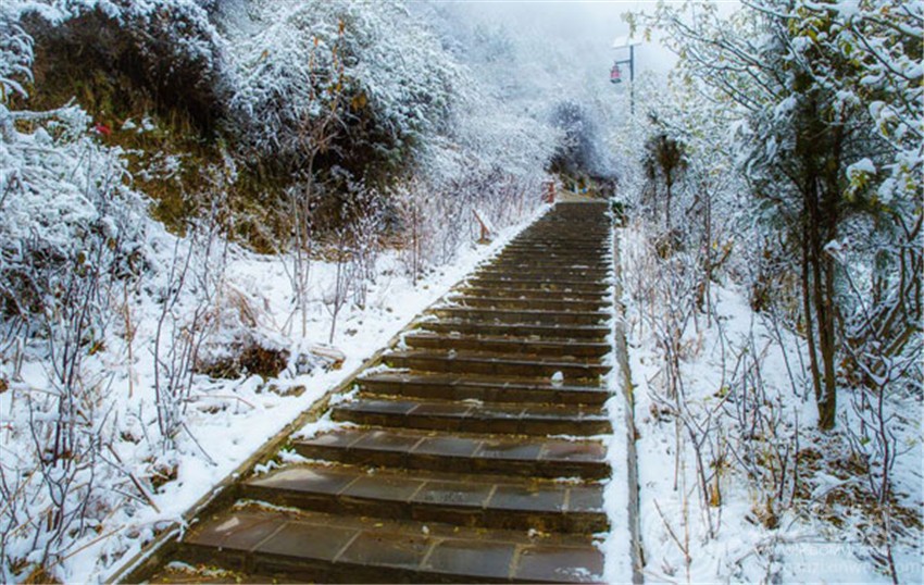 鋪滿“雪凇”的山谷,遠(yuǎn)看像森林撒上了一層糖霜,有人可能會誤認(rèn)為是東北的“霧凇”,但這種“雪凇”的白色底下還能看見隱約看到秋林的枝葉,獨有的南國雪景讓人產(chǎn)生“似花非花”的迷惑。