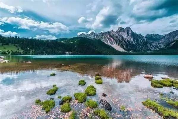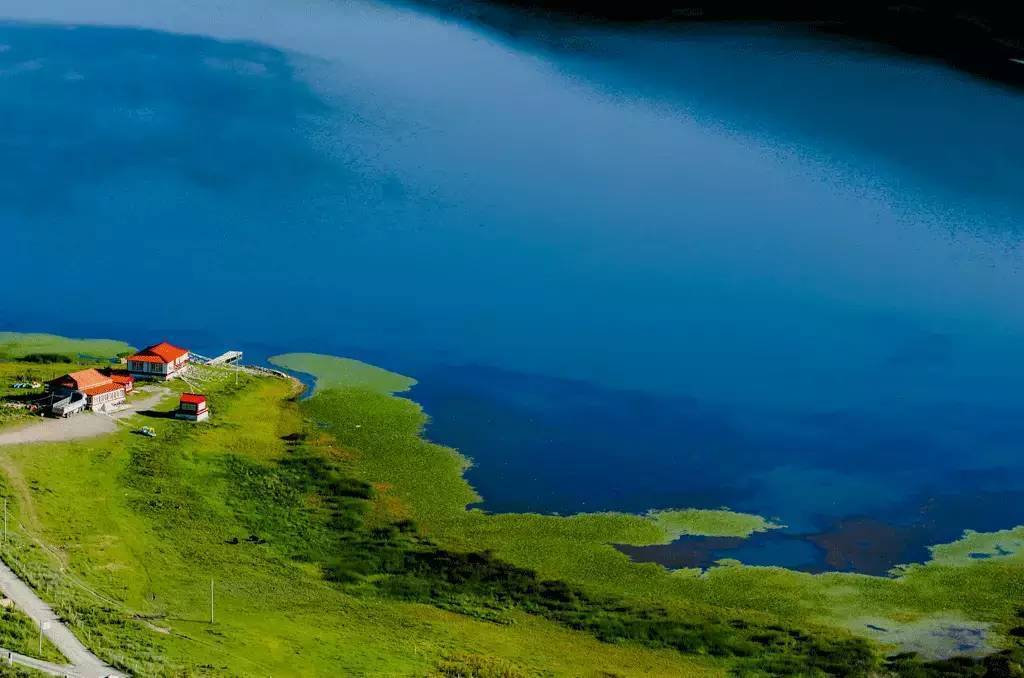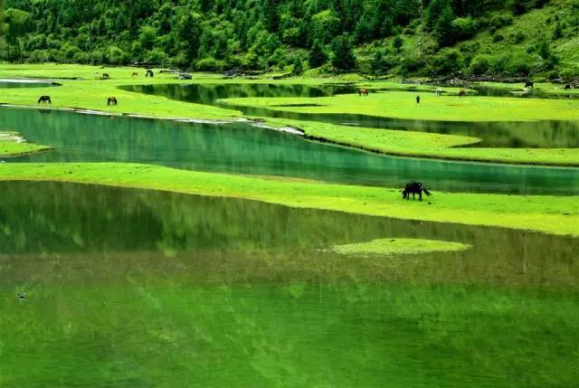 被原始森林和草甸環(huán)抱的五須海,當?shù)厝擞鳛椤跋膳釆y的明鏡”,湖水碧綠透亮,將周圍的山水和天空全映照在湖面,幽靜的像一幅畫。從夏到秋周圍百花盛開,古樹盤根錯節(jié)、藤枝攀沿纏繞,杜鵑樹伸向湖面,仿佛進入原始古樸的仙境。