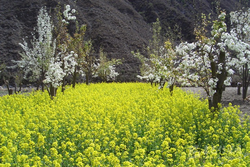 試想遠(yuǎn)處的雪山白雪皚皚,身旁有粉紅的桃花、雪白的梨花、金黃的油菜花,絢麗斑斕,光彩奪目,有春天的生機和活力,多了一種靈氣和不落塵埃的灑脫。賞花累了,沐浴在海螺溝的溫泉里,身體宛如畫龍點睛漂浮的暖云,能深切感受到來自海螺溝冰川地底的熱力。心境或怡然自得,或超脫塵世,或?qū)庫o澄明,或天人合一。春天里的海螺溝是花的海洋,是春的世界,是人間的仙境。