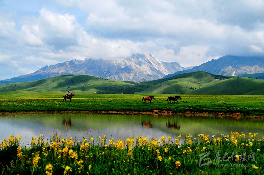 夕陽(yáng)照耀湖水,閃著金銀光;綠樹撐著青天,到處莽蒼蒼;牧民家的房子,五彩斑斕樣;藍(lán)色天空之上,白云在飄蕩;青石河岸之畔,繽紛百花香……這里是寫生的圣殿,這里有攝影的天堂,這里是讓人魂?duì)繅?mèng)縈的夢(mèng)里仙鄉(xiāng)。