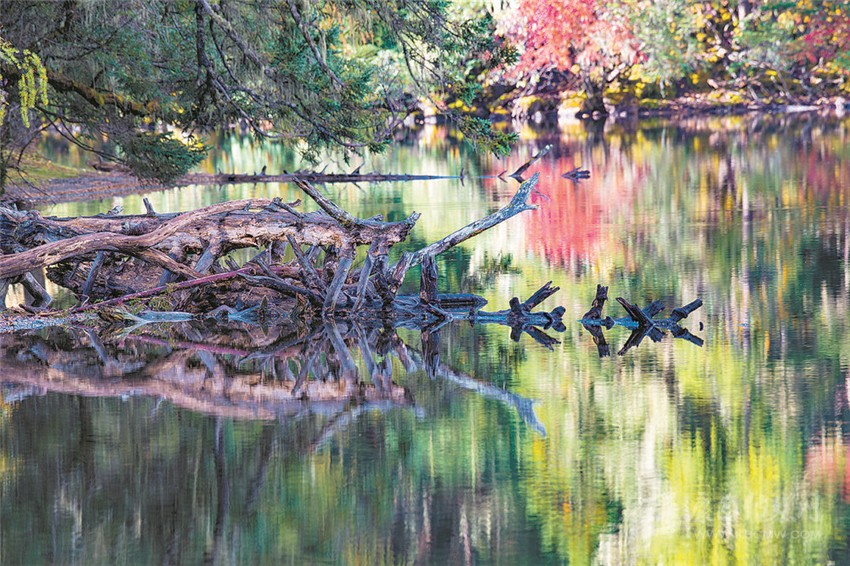 “江”與“湖”,靜臥于原始森林與草甸花海的之間,河溪清澈,湖水湛藍,真如秘密花園,人間仙境。湖畔最美的是盤根錯節(jié)的老柏樹,枝條彎曲如蒼龍,或立于湖畔,或臥于湖中,滿湖樹影、花影隨風搖曳。