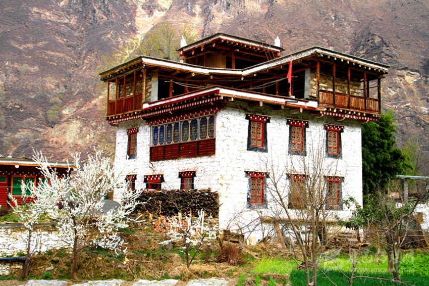 藏寨的梨花,并非成片的生長在一起,它們散落在村民的田間地頭和房前屋后,老干虬枝,滄桑感十足,仿佛是一個(gè)個(gè)“時(shí)間老人”,守望著藏寨的幸福變遷。