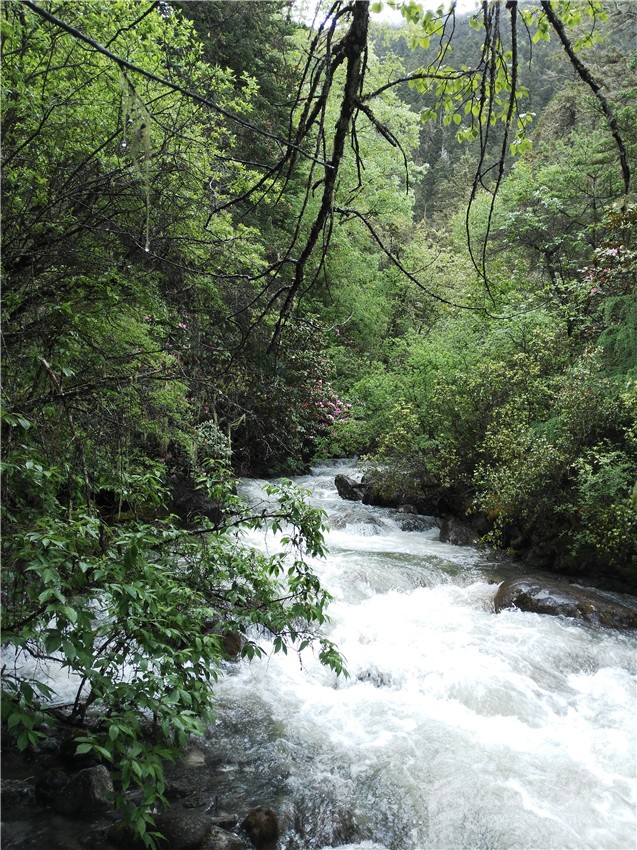 杜鵑花!又有美女的驚叫把我們的視線拉到了另一個(gè)方向,也即我們左手山坡上,一大片姹紫嫣紅的杜鵑花正灼灼綻放于郁郁蔥蔥的林木之間。而這時(shí)也就發(fā)現(xiàn)了,左手邊其實(shí)是一片花的海洋,各類不知名的花朵競相爭艷,把拉角溝初晴的時(shí)空打扮得格外妖艷。于是眾人紛紛拿出手機(jī)兼相機(jī),將這難得一見的景致拍攝下來,而這一過程中,美女們總忘不了騷首弄姿地把自己擺進(jìn)畫面之中,雖然這些美女都是妖婆級(jí)的美女了。至于男士,多數(shù)則呵呵笑著看著,頗有閑庭信步、云卷云舒之意。