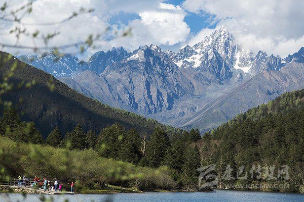 七色海左側,碧空下雪峰挺拔,銀光閃爍,圣潔而神秘,其狀恰如觀音菩薩足下的蓮臺,故名蓮花山。據(jù)當?shù)夭孛裰v,一年之中只有三分之一時間蓮花山才露出來,不得不說,這次來木格措的運氣實在太好,蓮花雪山映襯著美麗的七色海,宛如一幅極美的高原畫卷。