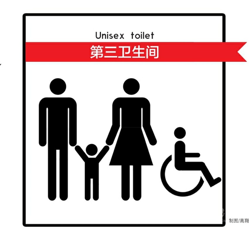 值得一提的是,四川的第三衛(wèi)生間還將有標示?!锻ㄖ凤@示,該標示上畫著一對夫妻牽著孩子,旁邊還有一個坐著輪椅的行動不便者。在畫面下方,注明了“第三衛(wèi)生間”字樣,英文“Unisex toilet”意為“無性別廁所”。 (據(jù)四川在線)