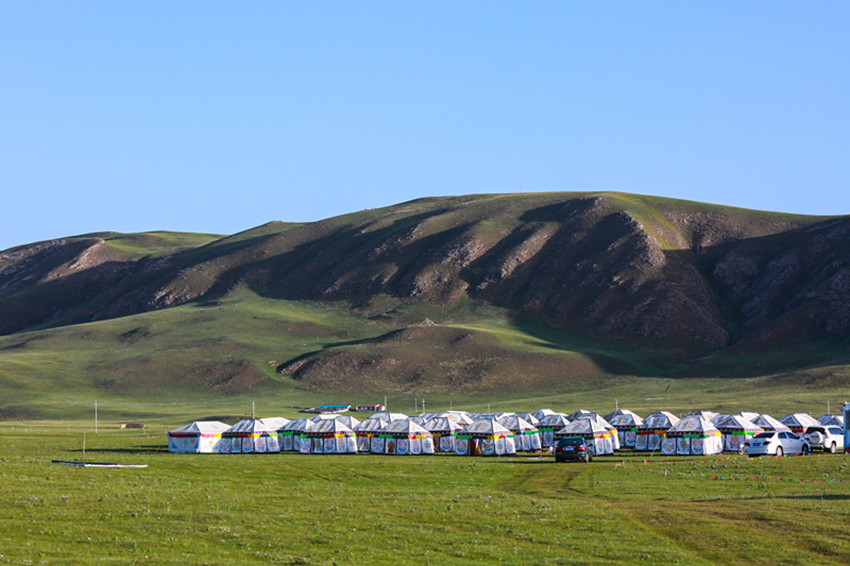 帳篷城。在絢麗的晚霞中,牦牛成為美麗的剪影,從數(shù)十頂雪白帳篷里透射出的星星點點的燈光,構(gòu)成一幅美麗的高原藏家風(fēng)情圖畫。