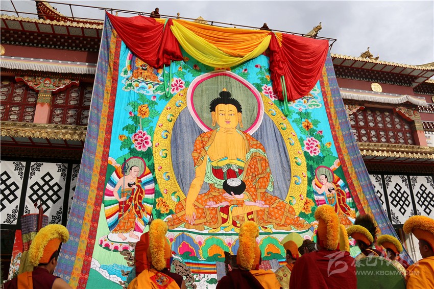 一大早,寺廟僧人身穿節(jié)日的盛裝,在莊嚴的鼓樂聲和誦經(jīng)聲中,僧眾們與廣大群眾仰望佛像,隨著黃綾的徐徐拉開,氣勢恢宏的巨幅佛像展現(xiàn)在眾人面前,預(yù)示人們平安吉祥,風調(diào)雨順,安康幸福。