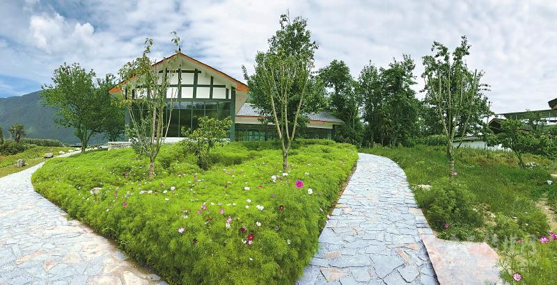 四畝田園酒店位于丹巴縣聶呷鄉(xiāng)高頂二村,其背依卡帕瑪群峰,面向墨爾多神山,是甲居藏寨的后花園。酒店精美的藏式外觀搭配了全玻璃的落地窗,讓美景無處不在眼前。房內(nèi)干凈整潔的大床、現(xiàn)代簡約的裝飾盡顯舒適與輕松。門廳內(nèi),古色古香的茶室無一不彰顯出店家的文雅與大方。房前屋后,姹紫嫣紅的花兒花香四溢,五彩的蝴蝶紛紛在花叢中翩翩起舞。后院的草地里,繁花盛開,一座小亭子、一架秋千、幾張?zhí)梢危@是心中的詩意和遠方,是“采菊東籬下,悠然見南山”的怡然自得和超凡脫俗。