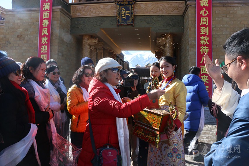 游客們剛到格薩爾王城門口就滿滿地感受到了當(dāng)?shù)厝嗣竦臒崆?,“嶺國四位大將”和“格薩爾王王妃”盛裝在城門口擊鼓迎接遠(yuǎn)道而來的客人們,為他們獻(xiàn)哈達(dá)、敬青稞酒,帶領(lǐng)大家轉(zhuǎn)煨桑爐祈福,在切瑪盒前體驗灑青稞和糌粑祈福儀式。隨后,游客們在王城體驗了喝圣水、祈福、騎馬、射箭等項目。王城內(nèi)宏偉的建筑,獨特的文化魅力,優(yōu)質(zhì)的服務(wù)質(zhì)量,讓遠(yuǎn)道而來的游客贊不絕口。