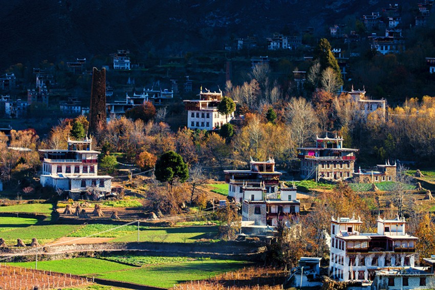 遠遠望去,一座座藏寨被色彩斑斕的彩林包圍之中,或稠密集中,或星落棋布,或在高山懸崖上,或在河壩綠茵間……伴著潺潺溪流,在緩緩升起的太陽照射下,隱在密林深處的寨房和農(nóng)田形成一幅美輪美奐的畫卷,可謂是“人間天堂”。