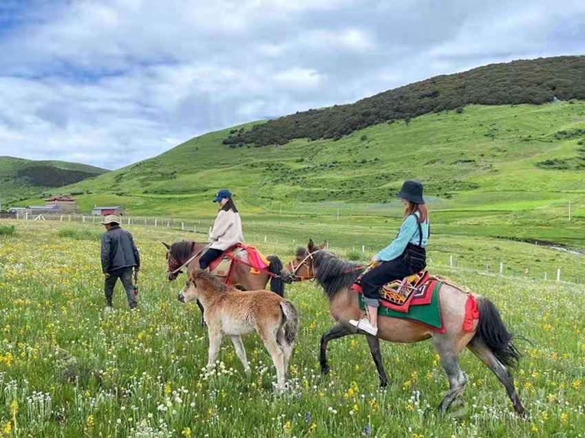 游客騎馬在花海穿行。