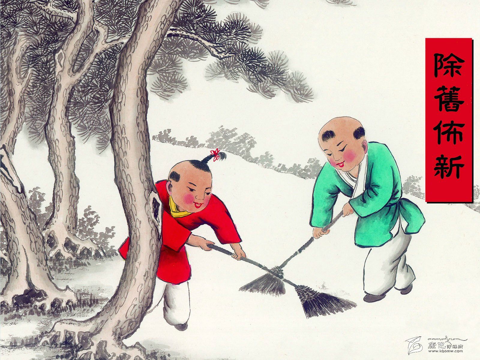 舉行過灶祭后,便正式地開始做迎接過年的準(zhǔn)備。每年從農(nóng)歷臘月二十三日起到除夕止,我國民間把這段時(shí)間叫做“迎春日”,也叫“掃塵日”。掃塵就是年終大掃除,北方稱“掃房”,南方叫“撣塵”。在春節(jié)前掃塵,是我國人民素有的傳統(tǒng)習(xí)慣。每逢春節(jié)來臨,家家戶戶都要打掃環(huán)境,清洗各種器具,拆洗被褥窗簾,灑掃六閭庭院,撣拂塵垢蛛網(wǎng),疏浚明渠暗溝。大江南北,到處洋溢著歡歡喜喜搞衛(wèi)生、干干凈凈迎新春的氣氛。