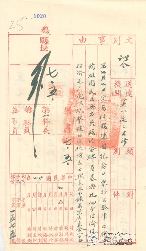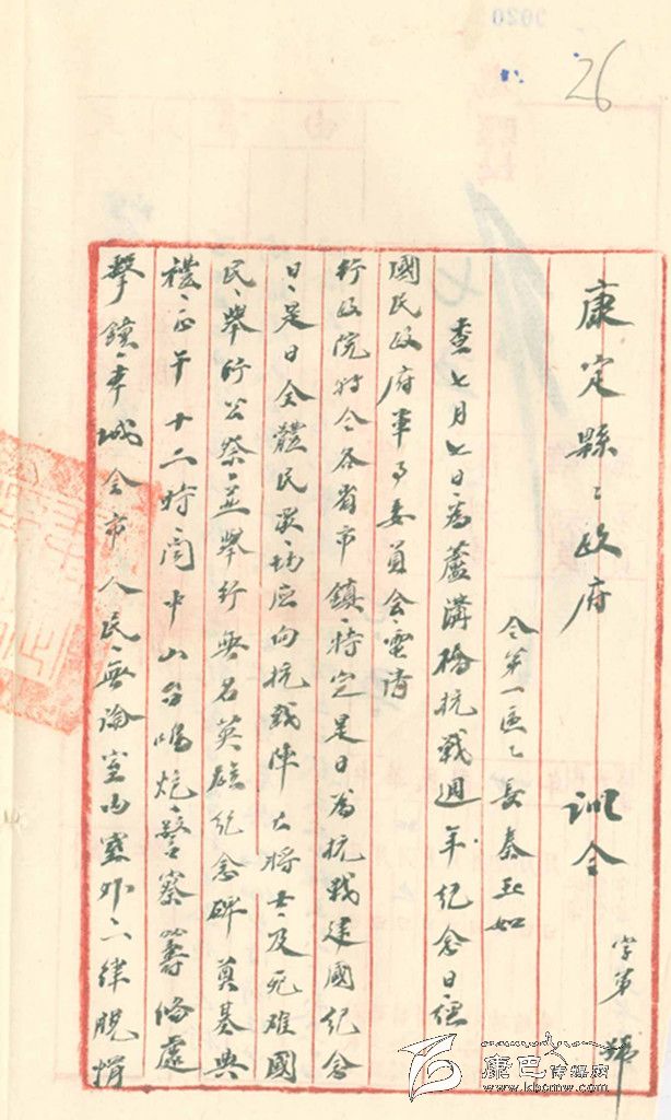 民國(guó)27年,即1838年7月5日,康定縣政府縣長(zhǎng)杜履謙發(fā)出“訓(xùn)令”,內(nèi)容如下:“查7月7日為盧溝橋抗戰(zhàn)周年紀(jì)念日,經(jīng)民國(guó)政府軍事委員會(huì)電請(qǐng)行政院特令各省市、鎮(zhèn):特定是日為抗戰(zhàn)建國(guó)紀(jì)念日。是日全體民眾均應(yīng)向抗戰(zhàn)陣亡將士及死難國(guó)民舉行公祭,并舉行無(wú)名英雄紀(jì)念碑奠基典禮。正午12時(shí),聞中山臺(tái)鳴炮,警察籌備處擊鐘,本城全市民,無(wú)論室內(nèi)室外,一律脫帽立正默哀五分鐘。禁止屠宰,素食一日。此令”。