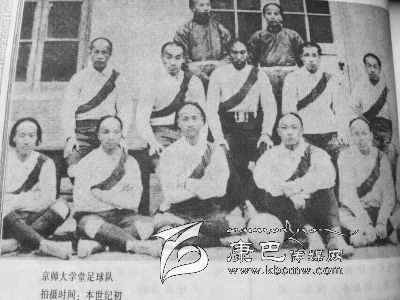 這是一張上個世紀(jì)初藏族人同英國人美國人在康巴高原踢足球的照片,地點是在川藏茶馬古道上的巴塘境內(nèi),從巴塘越過金沙江就是西藏地界。同樣的時間,京師大學(xué)堂(北京大學(xué)前身)建制完整的足球隊也為后人留下了一張同樣珍貴的合影照。