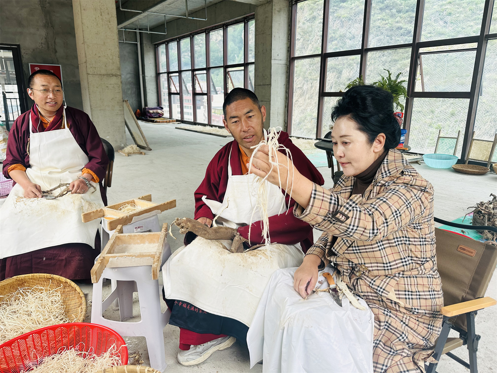 充巴正在教授藏紙制作技藝。