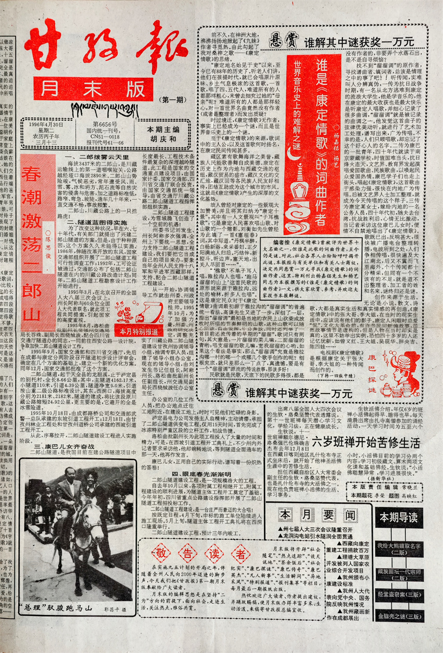 第一期“月末版”第一版除了楊嘉銘先生和他女兒楊藝的這篇文章,同時(shí)還刊載了陳思俊先生采寫的有關(guān)二郎山隧道建設(shè)的文章《春潮激蕩二郎山》,第二版刊載了七美多吉先生寫的《我給大熊貓取名字》;扎西次仁先生寫的《藏族畫壇一代宗師——安多強(qiáng)巴》;楊仕強(qiáng)先生寫的《余德康和十里魚香》,以及我寫的《歡天喜地下農(nóng)村》。第三版刊載了陳貴林先生寫的《經(jīng)堂盜竊案》;陳艾老先生寫的《金腦殼之謎》以及紫夫先生寫的《看熱鬧也深沉》。第四版刊載了尹凌寫的《俄羅斯之冬》??纯催@些文章,光是標(biāo)題就讓人有一種欲睹為快的沖動(dòng)。所以這張報(bào)紙一經(jīng)問世,便在州內(nèi)外引起了廣泛的關(guān)注,州內(nèi)更是一時(shí)洛陽紙貴,大家紛紛到郵局搶購(gòu),辦公室內(nèi)一報(bào)難尋。尤其是“萬元懸賞尋找《康定情歌》作者”一事在康定城內(nèi)的街頭巷尾引發(fā)熱議,想不到享譽(yù)世界的《康定情歌》,居然作者是誰都還不明白。幾天之后,在全國(guó)享有極大影響力的《羊城晚報(bào)》、《華西都市報(bào)》、《四川日?qǐng)?bào)》等知名媒體均在重要版面對(duì)此給予了轉(zhuǎn)載。