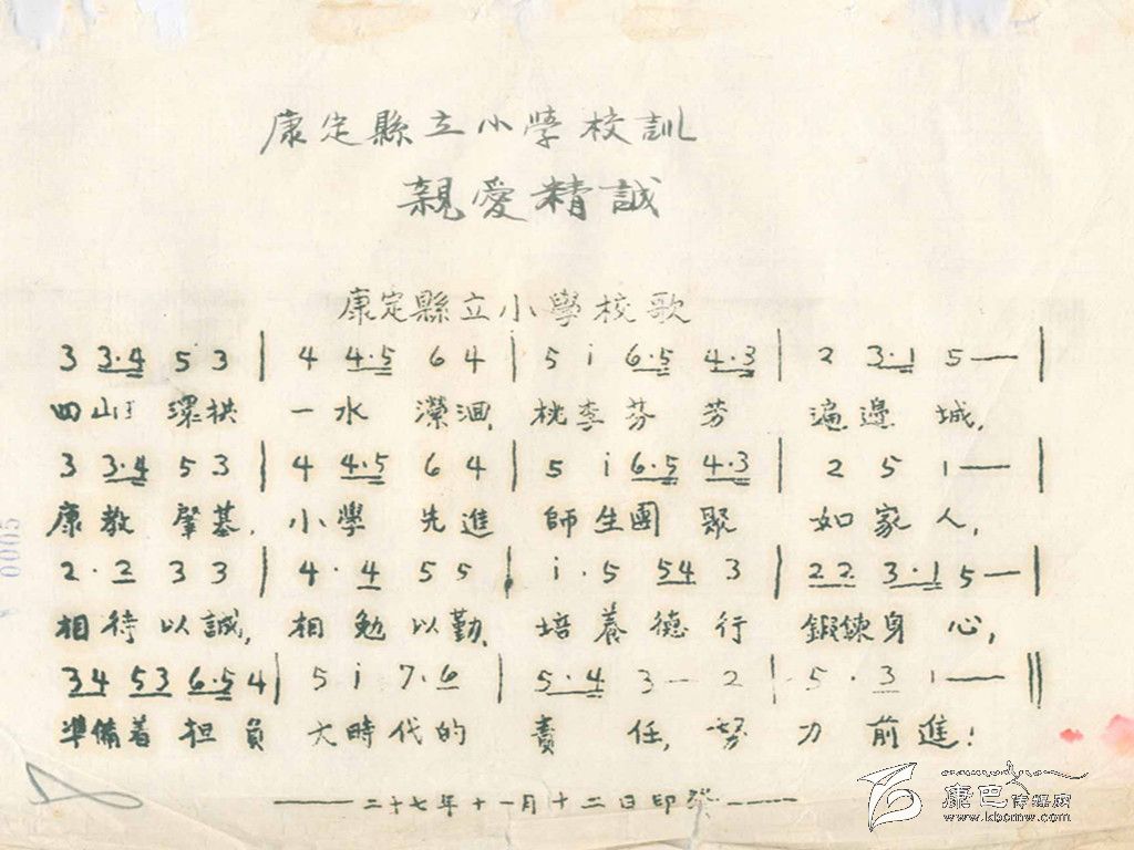 在眾多的民國教育檔案中,關(guān)于西康省各地學(xué)校的學(xué)生花名冊、學(xué)生成績表、學(xué)校經(jīng)費運用情況,以及教職工領(lǐng)取工薪的領(lǐng)條和表格等等有相當(dāng)大的一部分。難得的是,在這些檔案中竟然出現(xiàn)了兩份“歌譜”。細看卻不只是“歌譜”,而是兩所小學(xué)把自己學(xué)校的“校訓(xùn)”寫成的“校歌”。其中,一份是康定縣立小學(xué)依據(jù)校訓(xùn)“親愛精誠”寫成的校歌,另一份是日地短期小學(xué)依據(jù)校訓(xùn)“智仁勇”寫成的校歌。通過這兩份“校歌”,可以看到當(dāng)時小學(xué)教育已經(jīng)較為正軌,還開設(shè)有音樂課。“校歌”的內(nèi)容積極向上,充盈現(xiàn)在所說的“正能量”,鼓勵學(xué)生努力學(xué)習(xí),成為有擔(dān)當(dāng)?shù)娜恕?/div>