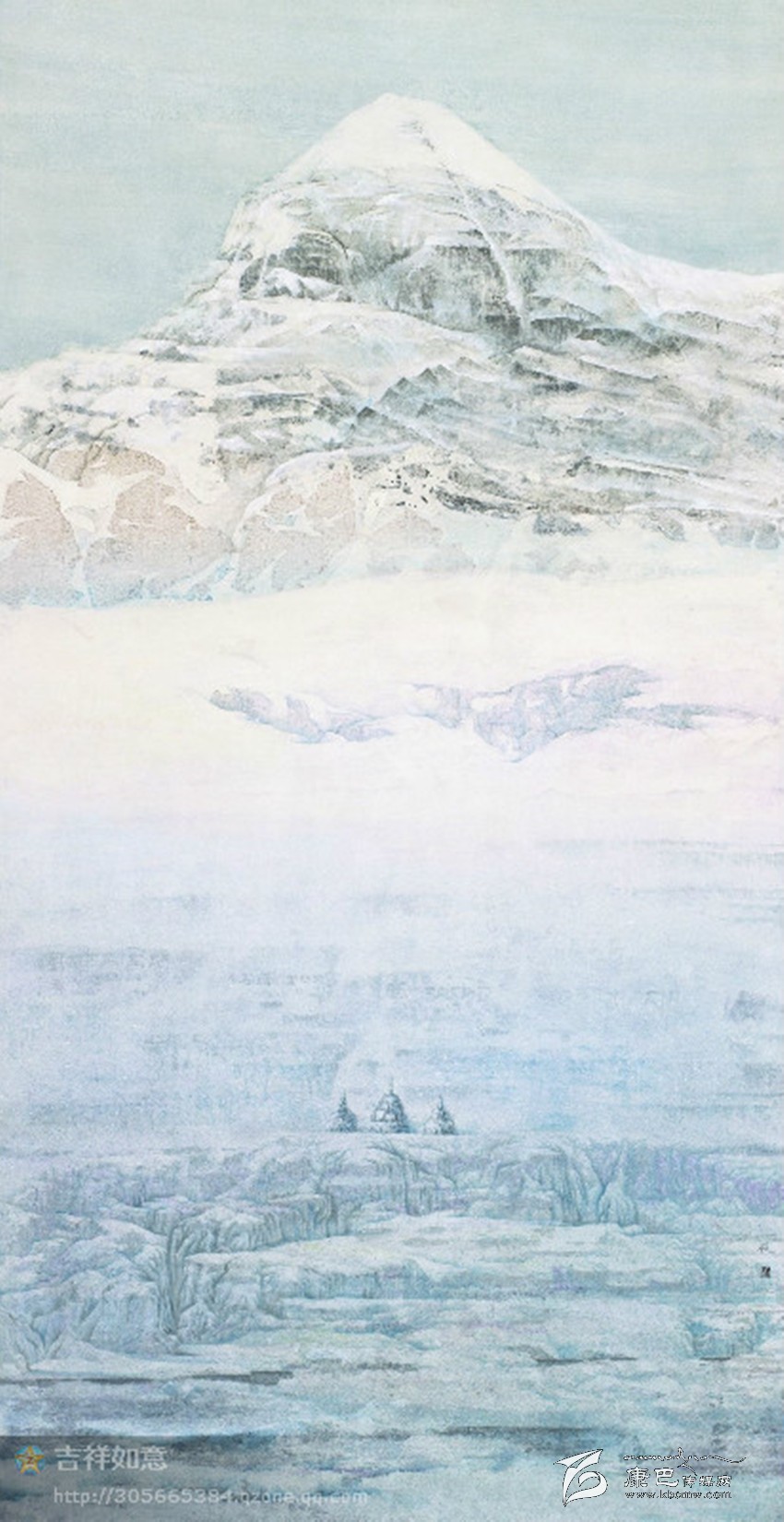 最后創(chuàng)作出了這張作品:神圣的岡仁波齊,您是世界中心;巍巍頂上是幾千年來(lái),帝釋天的居所;山下積雪皚皚,在滿是瑪尼的巖壁下,是象征佛、法、僧的三座石塔,又宛如你忠實(shí)的信徒正在對(duì)你娓娓述說(shuō)、虔誠(chéng)祈禱。時(shí)間的河流,正在您腳下寂靜、流逝、封凍。