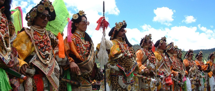 同時(shí),因?yàn)榭蛋筒貐^(qū)雪峰林立,氣候寒冷。以號(hào)稱地球第三極地聞名遐邇??蛋腿嗣袷朗来驮谶@世界屋脊上過著“逐水草而居”的游牧和半牧半農(nóng)的生活。因而在服飾上也形成了具有典型的雪域高原民族獨(dú)有的地方風(fēng)格特色??傮w呈現(xiàn)出寬大粗獷、英武健美、豪氣颯爽的特點(diǎn)和大襟、寬腰、長袖、超長、無扣的特征。而色彩是康巴藏族服飾點(diǎn)綴美的靈魂,他們在色彩運(yùn)用上十分著重色塊與整體的相襯與和諧,其運(yùn)用最多的紅、黃、藍(lán)、綠、白、黑,往往包含了宗教的象征意蘊(yùn),又歸納了雪域大自然所呈現(xiàn)的直觀表征:他們認(rèn)為藍(lán)、白、綠、紅、黃五彩是菩薩的服裝,藍(lán)色代表藍(lán)天,白色表示白云,綠色表示河流,紅色表示空間護(hù)法神,黃色表示大地。這是康巴人貼近自然的感恩之情和神性世界的精神延續(xù)的又一直接表達(dá)。