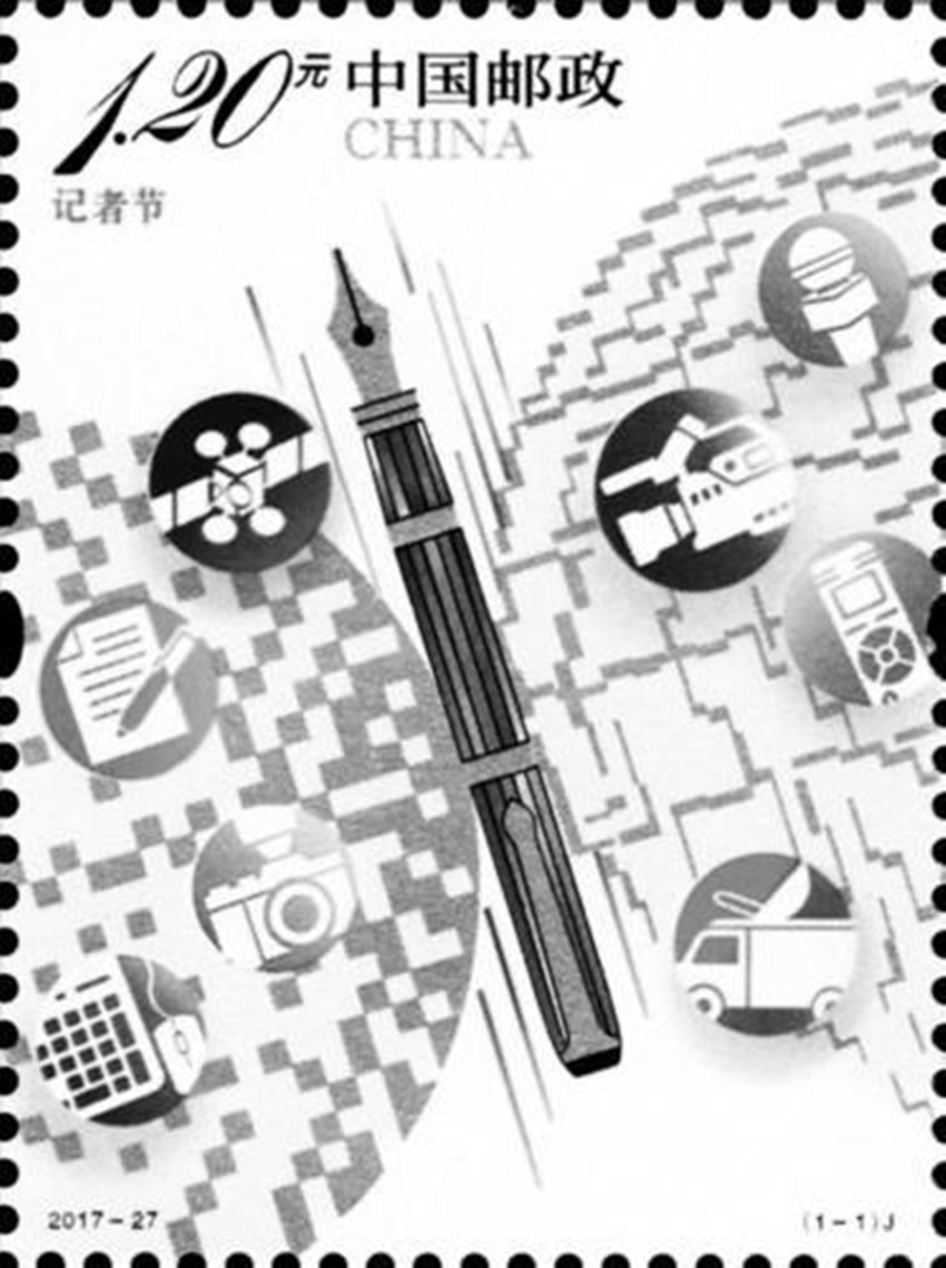 為紀念第18個記者節(jié)。中國郵政定于2017年11月8日發(fā)行《記者節(jié)》紀念郵票一套1枚。郵票圖案采用了具有現(xiàn)代感的構成手法及色彩表達方式。畫面中的鋼筆象征了記者秉持弘揚民族精神、維護國家利益和社會責任的專業(yè)精神和自信風范。兩側的線條及方點構成的兩個圓形圖案分別隱喻地球和現(xiàn)代網(wǎng)絡體系,表示在新媒體時代,新聞傳播媒介所呈現(xiàn)出的多元化、全球化的發(fā)展態(tài)勢。畫面中麥克風、攝像機、錄音筆等形式各異的采編設備圖標,結合衛(wèi)星及地面發(fā)射站等元素,突出了當代記者巨大的社會影響力。同時,鋼筆和兩側的圓形圖案共同組成了一只振翅飛翔的蝴蝶形象,喻意了記者追求至善至美,在探訪報道中擔負著傳播先進文化,引領和維護和諧社會,推動人類文明的崇高使命和社會責任。