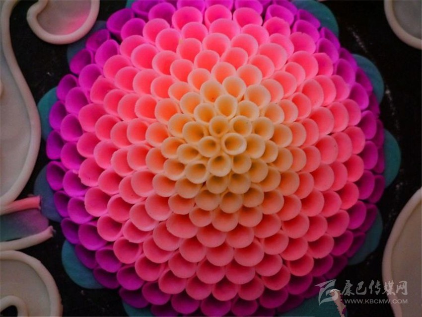 創(chuàng)作酥油花的工序是復(fù)雜、細(xì)致的:首先是確定油塑的題材,塑什么花,必須報請寺主審查通過;其次是揉和酥油,將各種顏料與酥油調(diào)和成彩色酥油;接下來是塑造基本模型,并按草圖扎制花架,涂塑鮮花的形體,將花朵、花葉、花莖安裝到花架上;最后,用金彩粉對整個酥油花進(jìn)行勾勒和裝飾……酥油花終于宣告塑成。