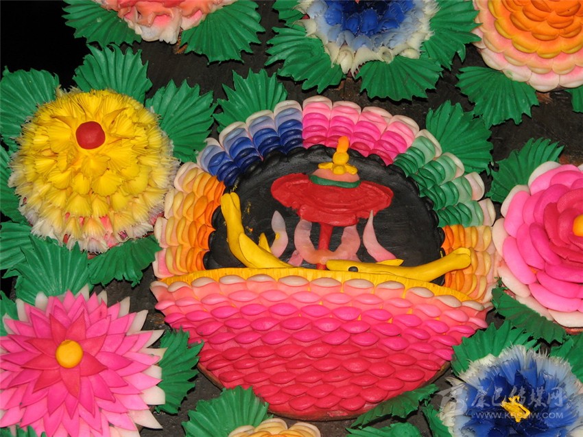 酥油花酥油花雖名曰“花”,但其題材多樣,內(nèi)容豐富,主要以佛祖神仙、菩薩金剛、飛禽走獸、花鳥魚蟲、山林樹木、花卉盆景組成各種故事情節(jié),形成完整的立體畫面。它的造型特點(diǎn)和手法類似國外盛行的臘像藝術(shù),但不宜長期保存。酥油花藝術(shù)繼承藏傳佛教藝術(shù)的精、繁、巧的特點(diǎn),在一個有限的空間中容納極多的內(nèi)容。大至一米到二米,小至十到二十毫米的人物走獸,個個精到,力求寫實(shí),而其姿態(tài)神韻力求傳神達(dá)意。在畫面布局上則繼承佛教壁畫中“異時同地”的處理方法,在同一畫面中將一個完整的故事內(nèi)容同時塑造出來。如大型酥油花《釋迦牟尼本生故事》。 酥油花的制作必須在冬季低溫下進(jìn)行,因而塔爾寺酥油花都在每年農(nóng)歷正月十五日塔爾寺燈節(jié)展出,屆時來自西藏、內(nèi)蒙古,四川等地的農(nóng)牧民及海內(nèi)外游人云集山之中,山上山下,寺宇周圍,入山人海,為一睹晶瑩剔透的酥油花。