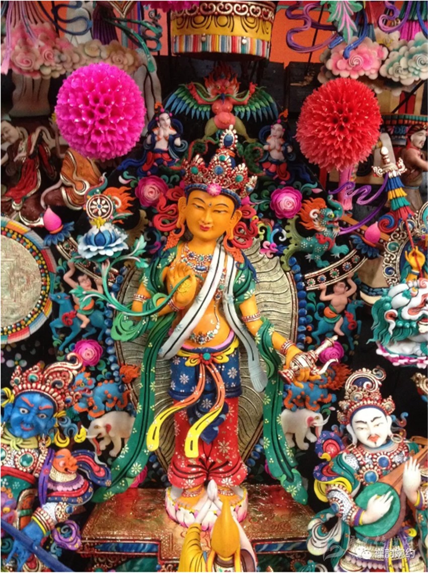 有傳說稱641年文成公主進(jìn)藏,帶去一尊釋迦牟尼12歲等身像并將其供奉于拉薩的大昭寺,當(dāng)?shù)厝罕娪盟钟妥龀苫ü┇I(xiàn)于佛前,以示崇敬之心,后各藏傳佛教寺院相繼使用,視為禮佛珍品,獻(xiàn)酥油花遂成為正月祈愿大法會的重要內(nèi)容。在發(fā)展過程中,酥油花的塑造方式、花色品種、內(nèi)容題材和工藝技巧都不斷發(fā)生著變化。