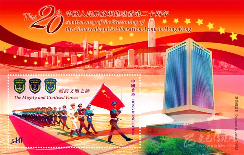 2017年6月20日,香港特別行政區(qū)郵政局發(fā)行了《中國人民解放軍進(jìn)駐香港二十周年》郵票小型張“威武文明之師”(圖7)。郵票主圖展示的是在“八一” 軍旗引導(dǎo)下,中國人民解放軍陸、海、空三軍儀仗隊(duì)的威武風(fēng)采。
