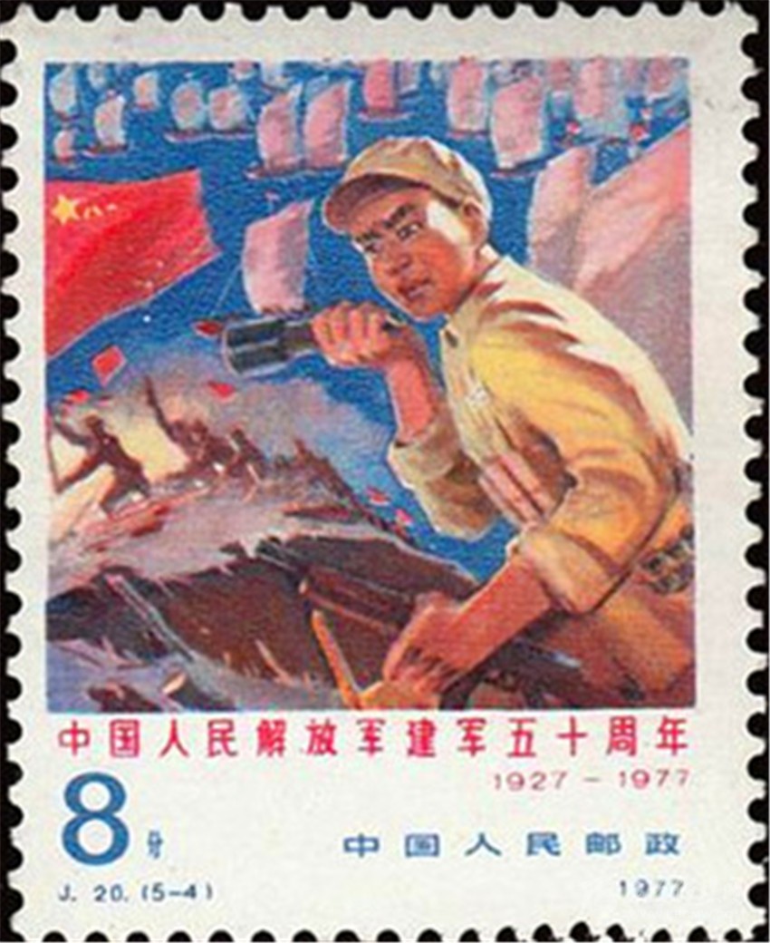 1977年8月1日原郵電部發(fā)行的《中國人民解放軍建軍50周年》紀(jì)念郵票,其中第4枚“雄師過大江”(圖3),圖案中一名沖在渡江隊(duì)伍前面的戰(zhàn)士高舉一面“八一”軍旗。
