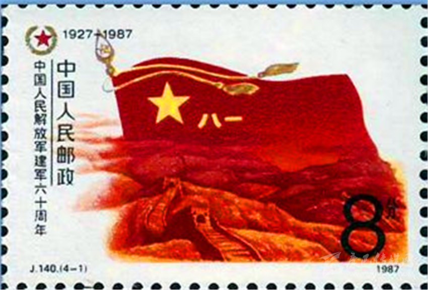1987年8月1日原郵電部發(fā)行的《中國人民解放軍建軍60周年》紀(jì)念郵票一套4枚。其中第1枚“軍魂”(圖4),郵票上一面鮮紅的“八一”軍旗迎風(fēng)飄揚(yáng),旗下是蜿蜒的萬里長城,代表了中國人民解放軍是保衛(wèi)祖國和人民的“鋼鐵長城”。